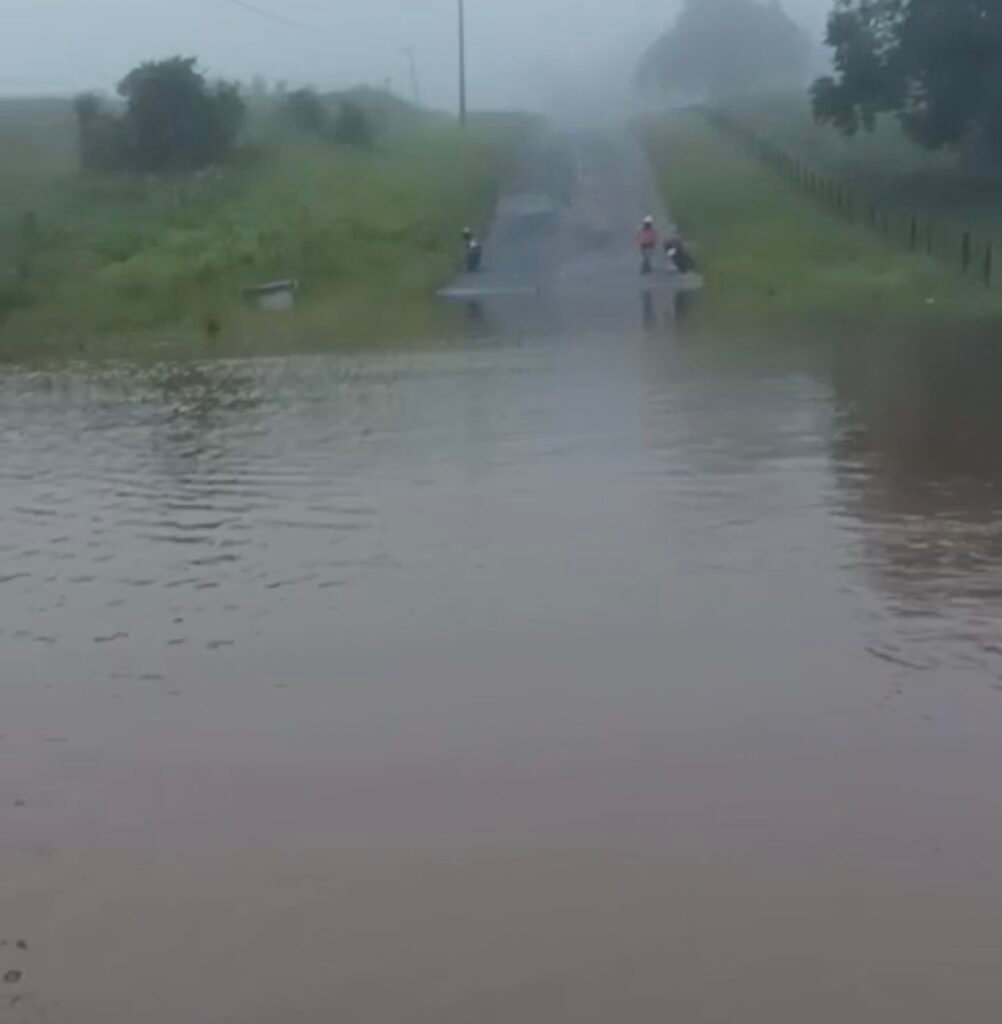 De acordo com moradores da região, a água tomou conta da pista após a forte chuva registrada na noite anterior, impedindo a passagem de veículos. “Não estamos conseguindo passar para ir trabalhar”, relatou um morador, destacando os transtornos enfrentados por quem depende da rodovia para se deslocar diariamente.
