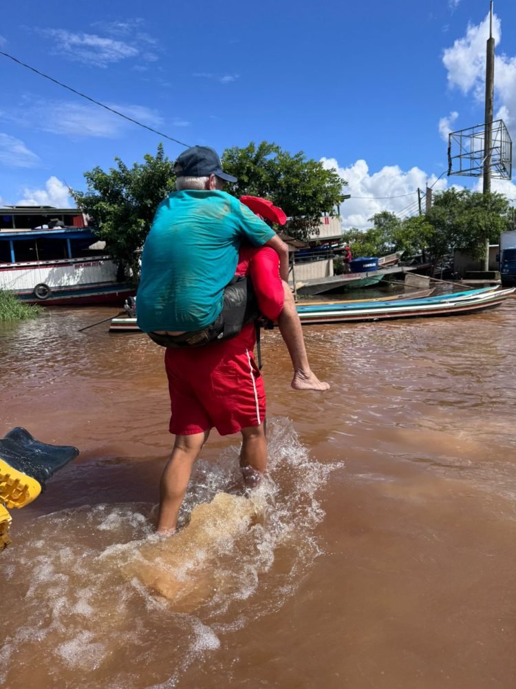 Bombeiro carrega idoso nas costas durante resgate em área alagada no Rio Juruá