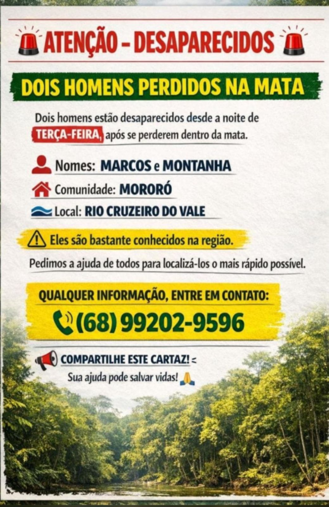 Dois homens, identificados como Marcos e conhecido como “Montanha”, estão desaparecidos desde a noite da última terça-feira após se perderem em uma área de mata na região do Rio Cruzeiro do Vale, nas proximidades da comunidade Mororó, no interior de PORTO WALTER.
