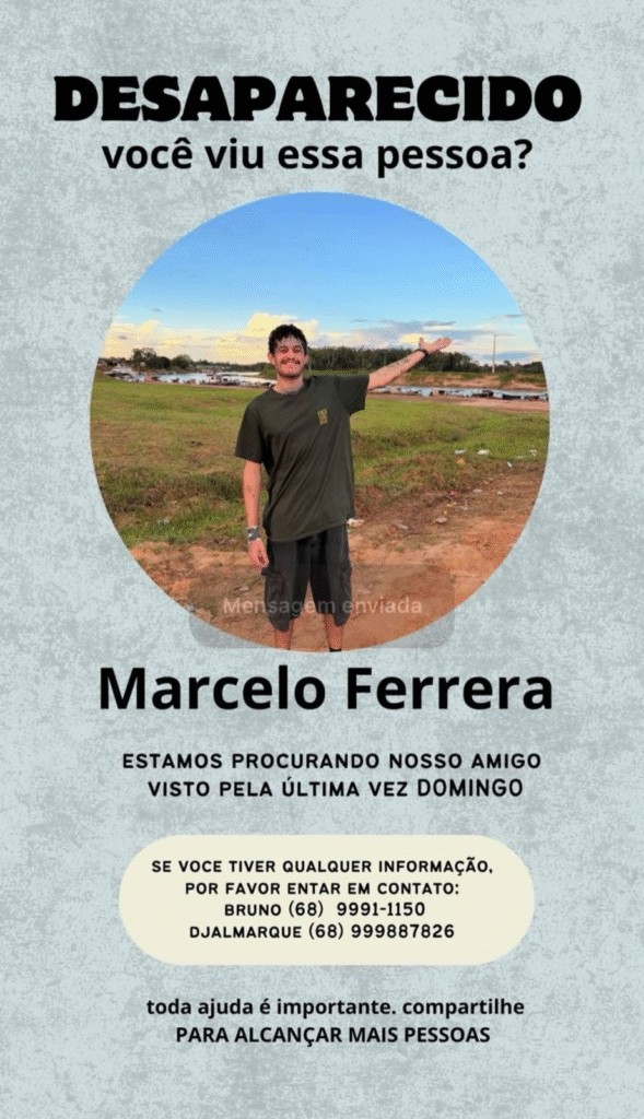 Amigos e familiares procuram por Marcelo Ferrera, de 31 anos, desaparecido desde o sábado, 22 de novembro, em Rio Branco. Ele foi visto pela última vez no bairro Abraão Alab, na capital acreana, e desde então não deu mais notícias.