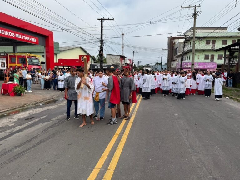 Nesta sexta-feira (3), milhares de fiéis católicos participaram da tradicional Via Sacra, uma das celebrações mais emocionantes da Semana Santa na cidade. A procissão, que revive os passos de Jesus Cristo rumo ao Calvário, percorreu as ruas do município com orações, cânticos e reflexões profundas sobre a Paixão e Morte do Senhor.