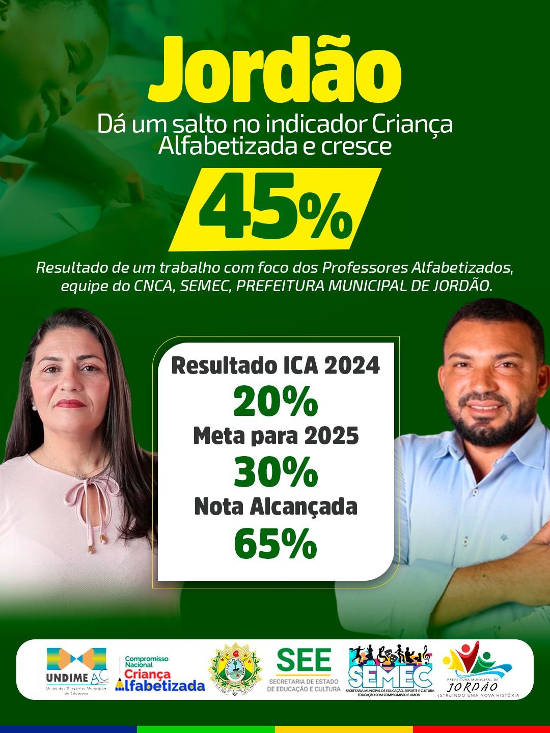 O prefeito de Jordão, Naudo Ribeiro, também celebrou a conquista e reforçou o compromisso da gestão com a área. “Esse resultado é motivo de orgulho para todo o povo de Jordão. Investir em educação é investir no futuro do nosso município. Parabenizo cada profissional envolvido por esse grande avanço e reafirmo nosso compromisso em continuar apoiando e fortalecendo a educação, garantindo melhores condições de ensino e aprendizagem para nossas crianças”, destacou.