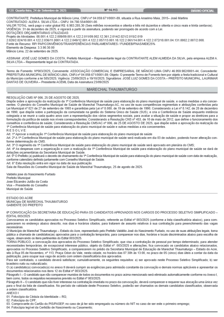 A Prefeitura de Marechal Thaumaturgo divulgou nesta quarta-feira, 24, a 6ª convocação dos candidatos aprovados no processo seletivo simplificado (PSS), Edital nº 003/2025, voltado para contratação temporária de profissionais para a Secretaria Municipal de Educação.