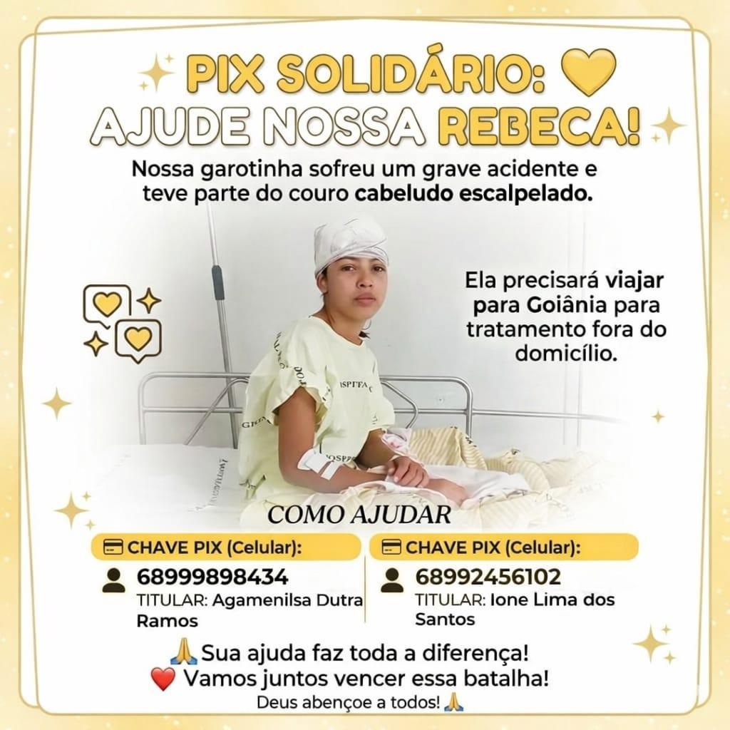 Familiares e amigos estão mobilizados em uma campanha solidária para ajudar com os custos do tratamento, deslocamento e demais despesas. Quem puder contribuir pode realizar doações via Pix: Chave Pix (celular): (68)99989-8434; titular: Agamenilsa Dutra Ramos ou chave pix (celular): (68)99245-6102; titular: Ione Lima dos Santos.