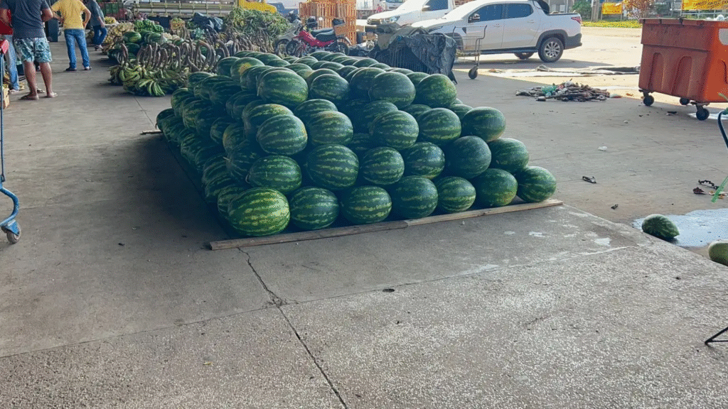 Além da banana, a safra de melancia também tem contribuído para o movimento no entreposto, atraindo compradores e abastecendo o mercado local. Os preços variam de 5,00 a 20,00 reais.