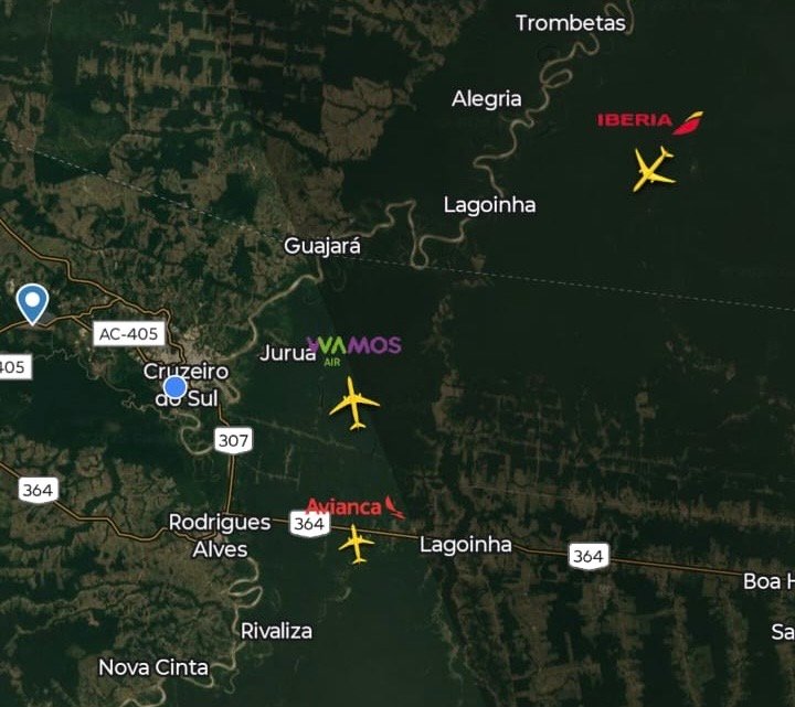Moradores de Cruzeiro do Sul, no interior do Acre, registraram o sobrevoo de três aviões ao mesmo tempo no céu da cidade, o que chamou a atenção de quem presenciou a cena.